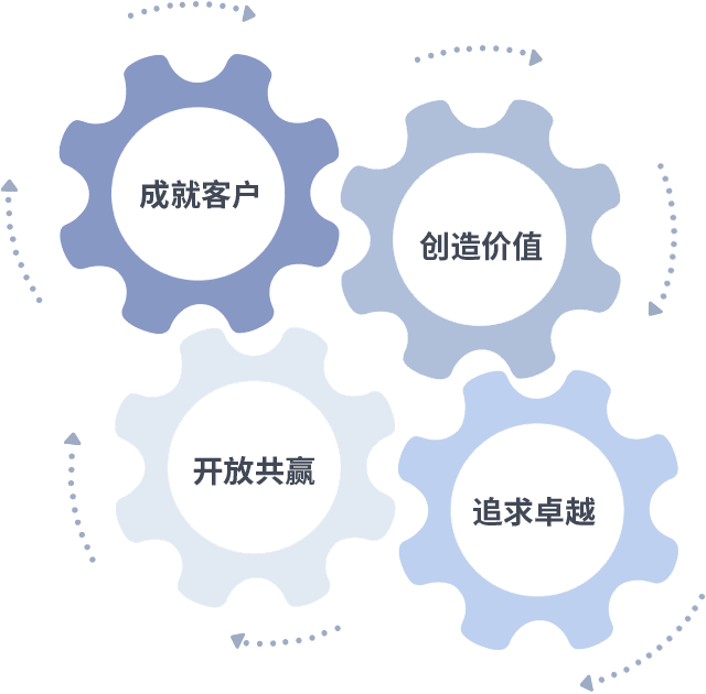 成就客户是一切决策的出发点,,创造价值是衡量所有工作的标准,,追求卓越是我们做事做人的态度,,,开放共赢是我们的格局也是最终的结果。。。价值观的齿轮环环相扣,,,推动着组织里的每个人不断向前。。。