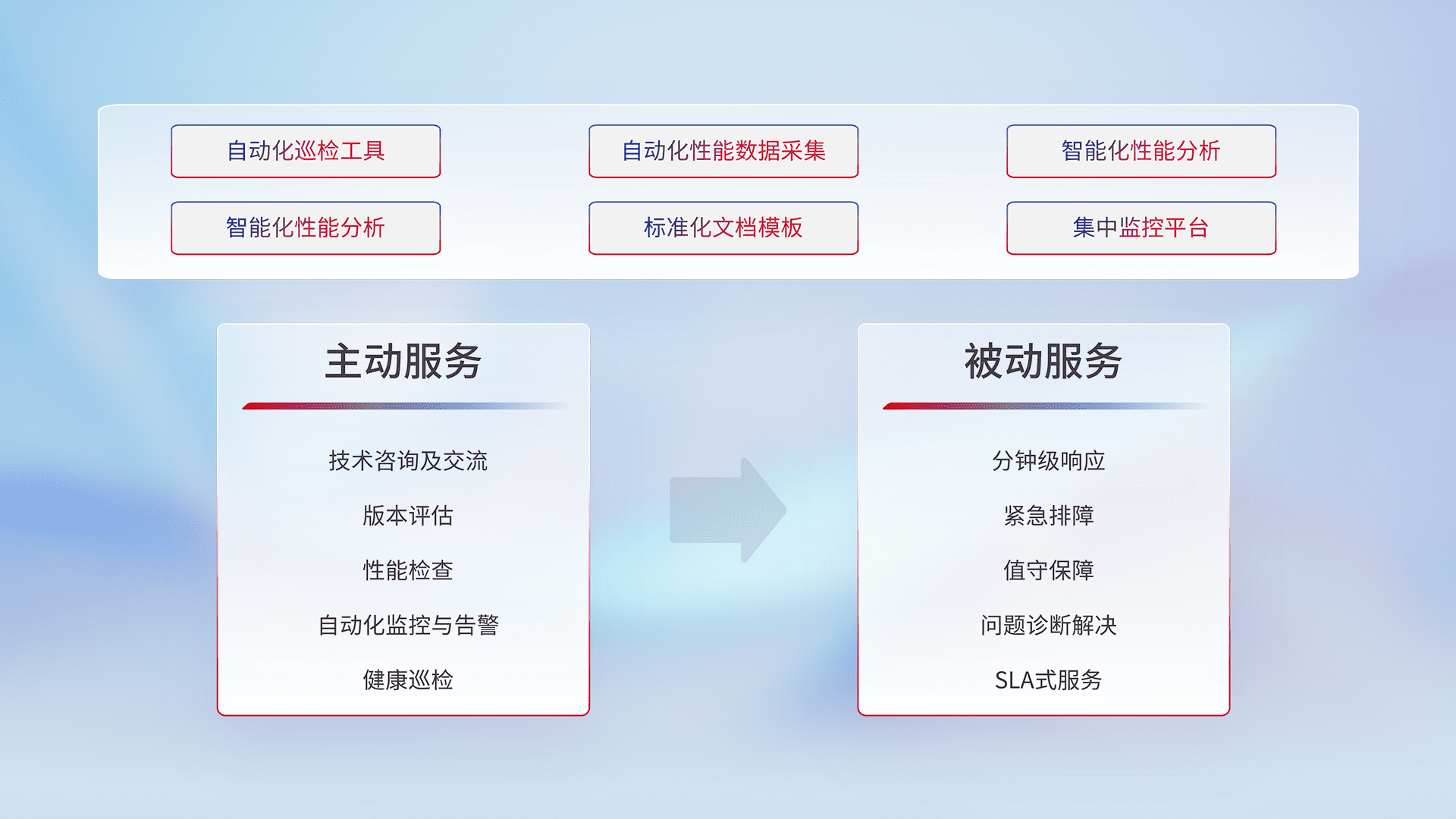智能化工具和标准化文档,,,保障服务质量,,,,提供主动服务(包含技术咨询、、版本评估、、、、性能检查、、、自动化监控与告警、、、、健康巡检)和被动服务包含(分钟级响应、、、紧急排障、、值守保障、、、问题诊断解决、、SLA服务)。。。。
